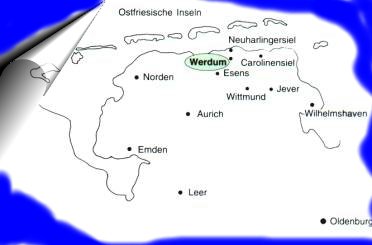 Dann die B 210 nach Wittmund. In Ortsmitte Wittmund folgen Sie dem Wegweiser nach Carolinensiel. Nach ca. 10 km links nach Werdum (ausgeschildert). |